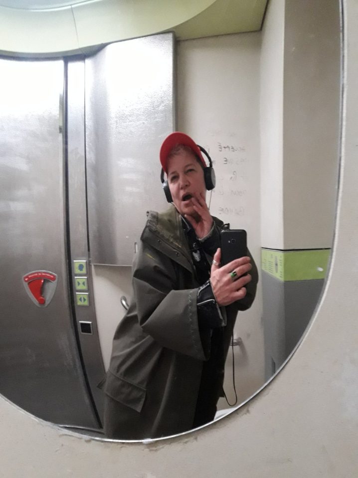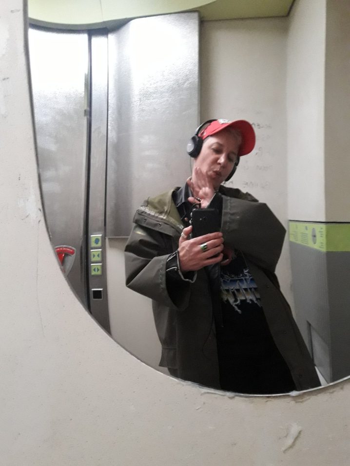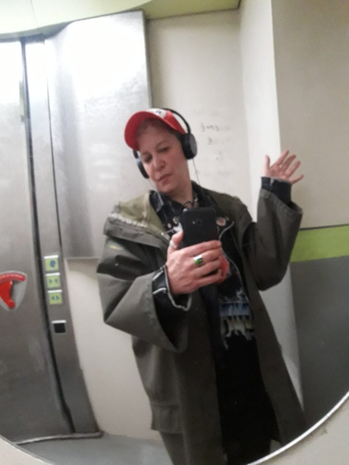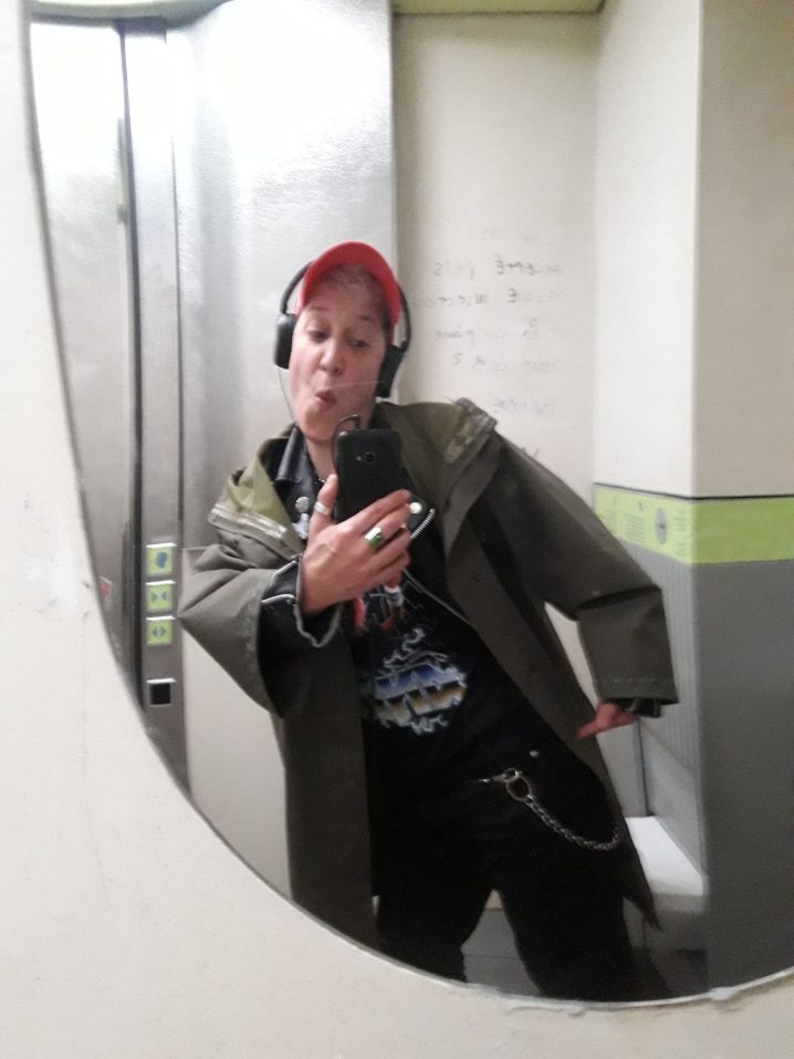 Casquette de poubelle, patch maison. Imper de fripe, perf en plastique, tish à message, chaine de branlouse chinée dans le marais pas poitevin. Bijoux Cärtier.