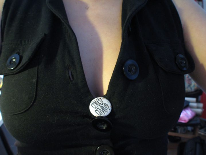 Badge de chez Mickson Fashion (magasin Shot Down), rouillé à l’ancienne selon la méthode secrète jalousement gardée de la machine à laver. Le petit plus : il retient très bien ce bouton qui menace de lâcher les loches sans crier gare !