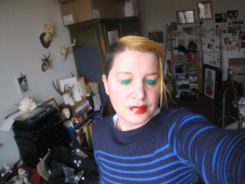 Voilà le résultat en restant assez sobre, vert qui tire sur le turquoise pour les paupières, rouge classique pour les lèvres