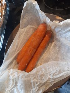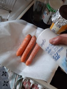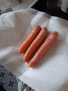donc faut laver les carottes sans les peler, dans un plat creux assez profond de type pyrex, mettre la moitié du kilo de gros sel, déposer les carottes entières dessus sans les essuyer en faisant gaffe à ce qu’elles touchent pas le plat comme dit la recette que j’avais trouvée mais je sais plus où :/