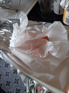emmitouflez à nouveau  tout ça dans de l’alu pour faire une petite bûche parce que les carottes mettent  plus de temps à cuire que du poisson, et placez la petite bûche  dans l’âtre en pyrex parce que vous avez cassé tous les autres.