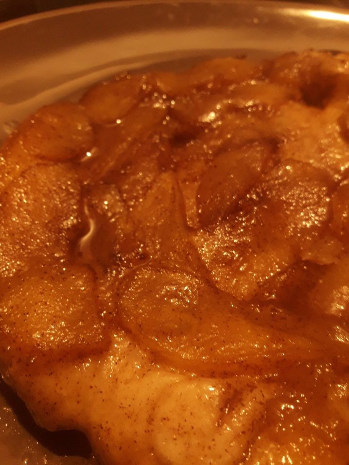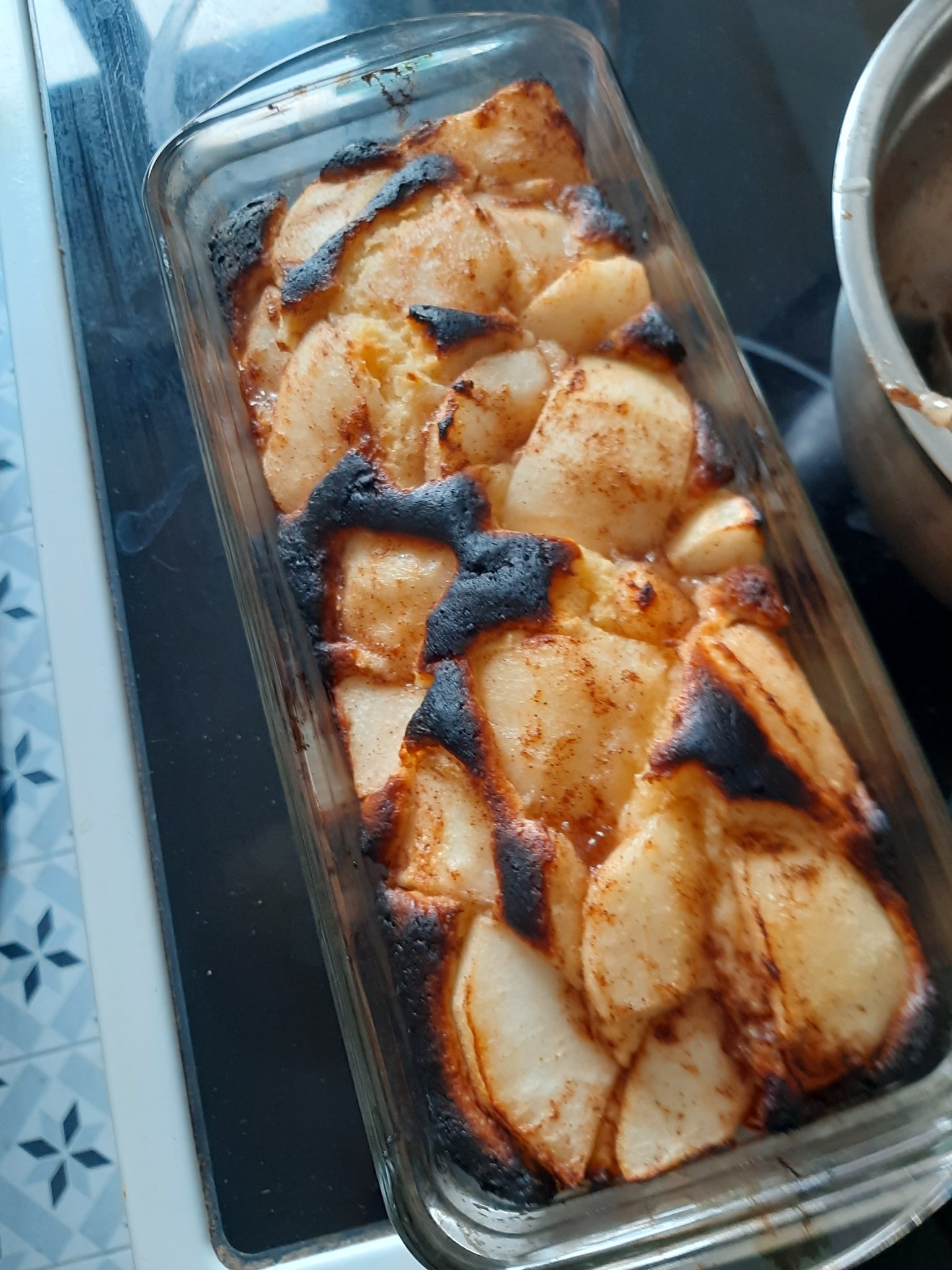 j’ai fait mon « feuilletage » comme la dernière fois, mais ma pâte avec trop de beurre (non pardon, y’a jamais « trop » de beurre, pardonnez moi mon offense Saint Robuch) avait fini par fusionner avec le support où je l’étalais. Alors bon j’ai disposé mes lamelles de pommes (désormais avec du jus qui a bien suinté) dans le fond de mon moule à manqué, j’ai versé le jus  par dessus et j’ai fait de la maçonnerie avec la pâte par dessus. Je me suis dit que ça fait un peu tatin-couignamane, encore une fois, je voyais pas trop comment du beurre du sucre de la cannelle de la farine et des pommes pouvaient donner un truc dégueu à la fin, qui vivra verra, il faut vivre intensément, carpe diem, etc.