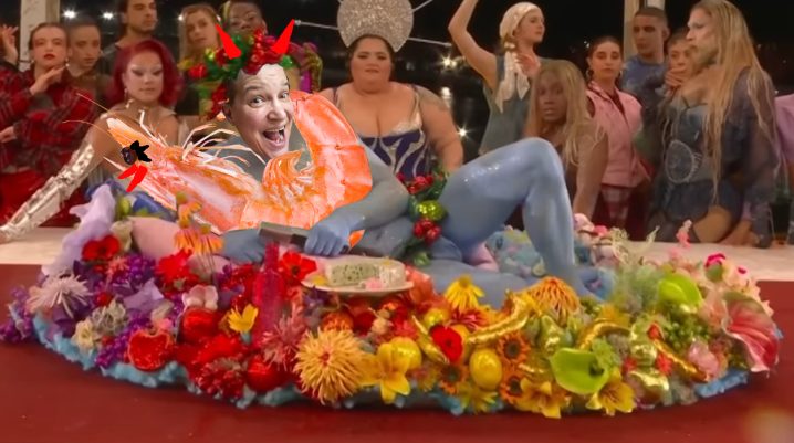 Préchauffez un studio sous les toits à  52° avec Cephalic Carnage à fond. Quand la sueur qui vous dégouline de sous les nichons commence à crépiter, ouvrez le frigo pour en sortir la salade flétrie mais encore un peu fraiche, agencez-la élégamment avec les chips dans la lèchefrite dans laquelle vous aurez disposé quelques glaçons à l’huile. embrassez la grosse crevette froide, et laissez mijoter 2 ou 3h en arrosant de jus régulièrement. c’est prêt ! servir avec un très gros bol de mayonnaise.