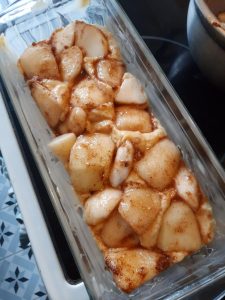 Donc comme la fois précédente, j’ai mélangé du beurre (rappel que le beurre doux n’existe pas) et du sucre (à proportions égales, ça c’est décidé au pif aussi), j’ai mis la pommes tranchée en lamelles (et pas en quartiers, histoire de varier) à mariner une fois saupoudrée de sucre et de cannelle.