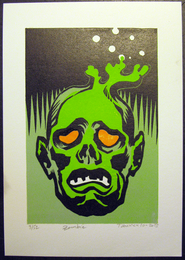 Linogravure en réduction 4 couleurs, encre à l’eau (couleur) et offset (noir) sur papier Dorée 170gr 15x21cm tirage de 52 exemplaires numérotés et signés